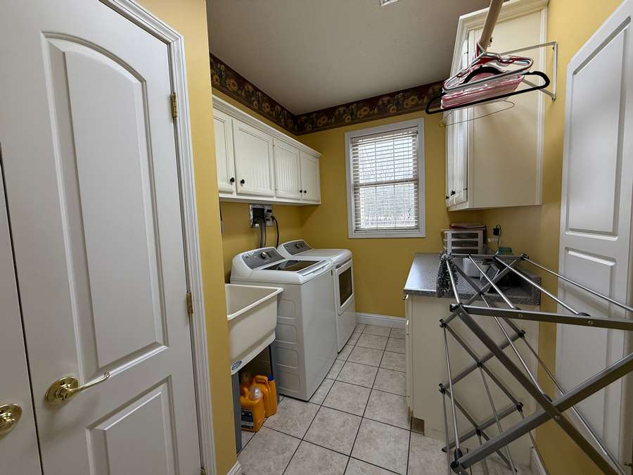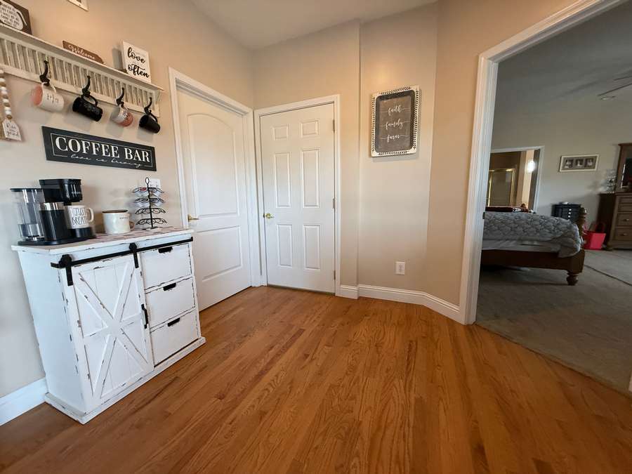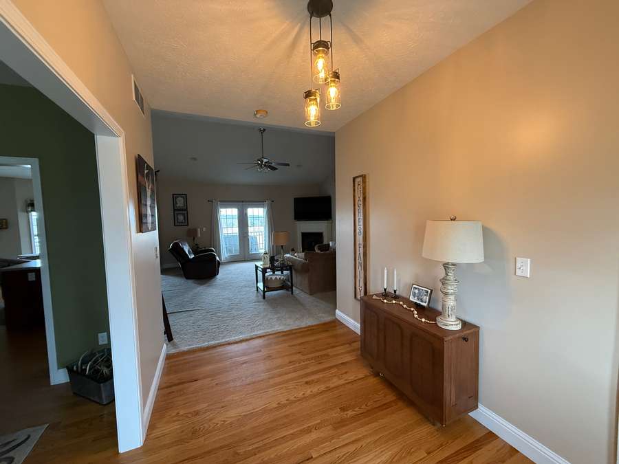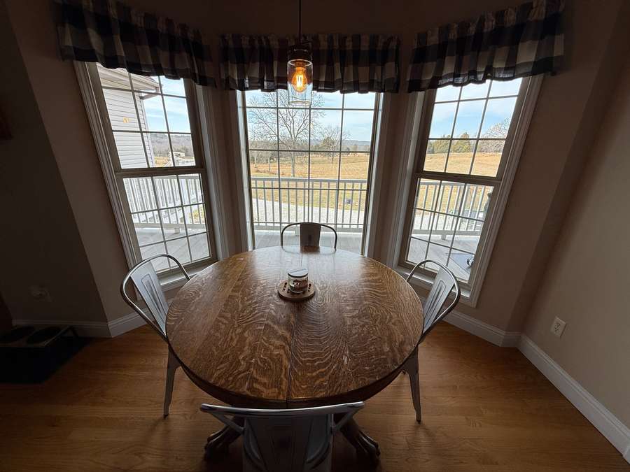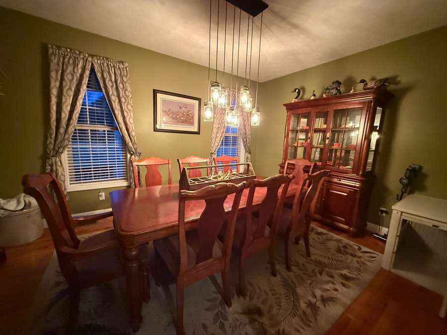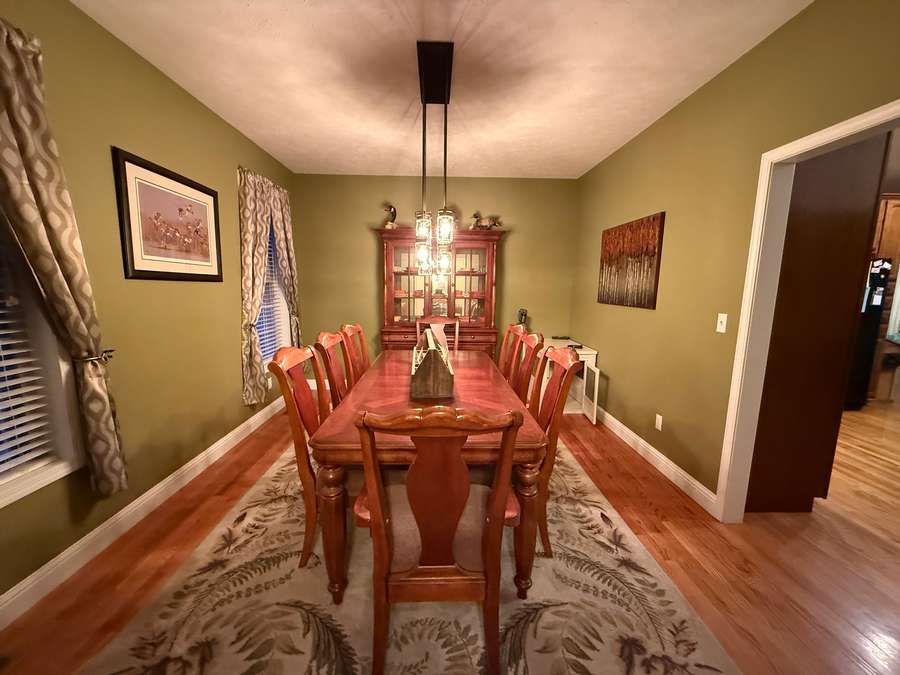 Step inside to the main floor’s open-concept family room and kitchen, where everyday living and entertaining come together effortlessly. The heart of the home is the thoughtfully designed kitchen, featuring a large island with bar seating and stunning Amish-crafted custom cabinetry, perfectly planned for meal prep, gatherings, and making memories. Just off the kitchen, a bright bay-window breakfast nook offers peaceful views of the surrounding land—an ideal spot for morning coffee or casual meals. For outdoor dining and grilling, the covered deck with low-maintenance Trex decking is conveniently accessed from the kitchen, while the elegant formal dining room is ready for hosting holidays and special occasions. Hardwood floors flow throughout this entire space, including the welcoming foyer and entry from the attached two-car garage.